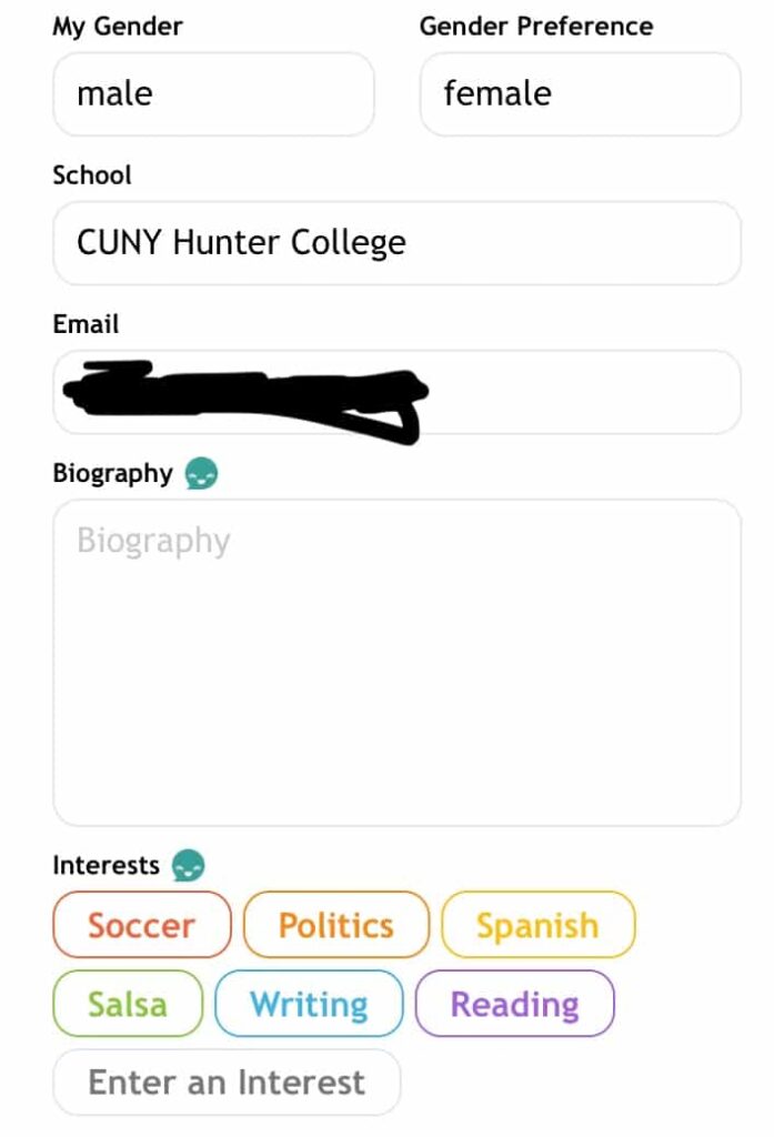 To get started you have to fill out some basic information such as your name and sexual preference before verifying that you’re in college or have graduated.
