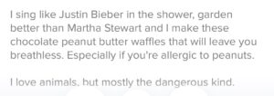 Instead, talk about what makes you unique. Showcase your personality. If you have deal breakers list them in a fun way. If you want emotionally stable men, say that you want a guy who still calls his mom every once in a while instead of writing ONLY EMOTIONAL STABLE MEN.